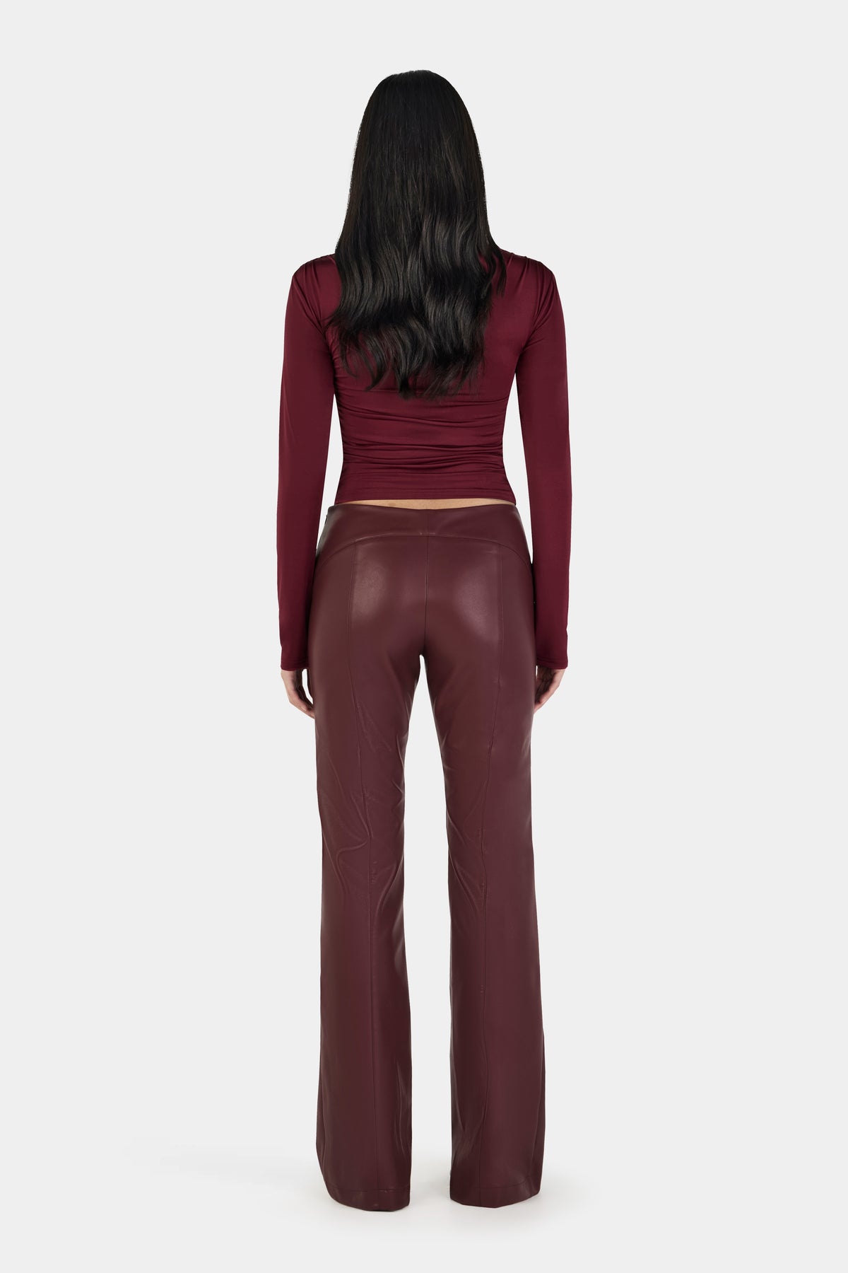 The Jetta Top is a fitted long sleeve style crafted from a slinky jersey fabrication with a subtle sheen. Designed to contour the body, it features softly draped, crossover detailing across the front that creates a flattering wrap effect through the neckline and waist. Gentle gathering at the side body enhances the shape while maintaining a smooth finish.
