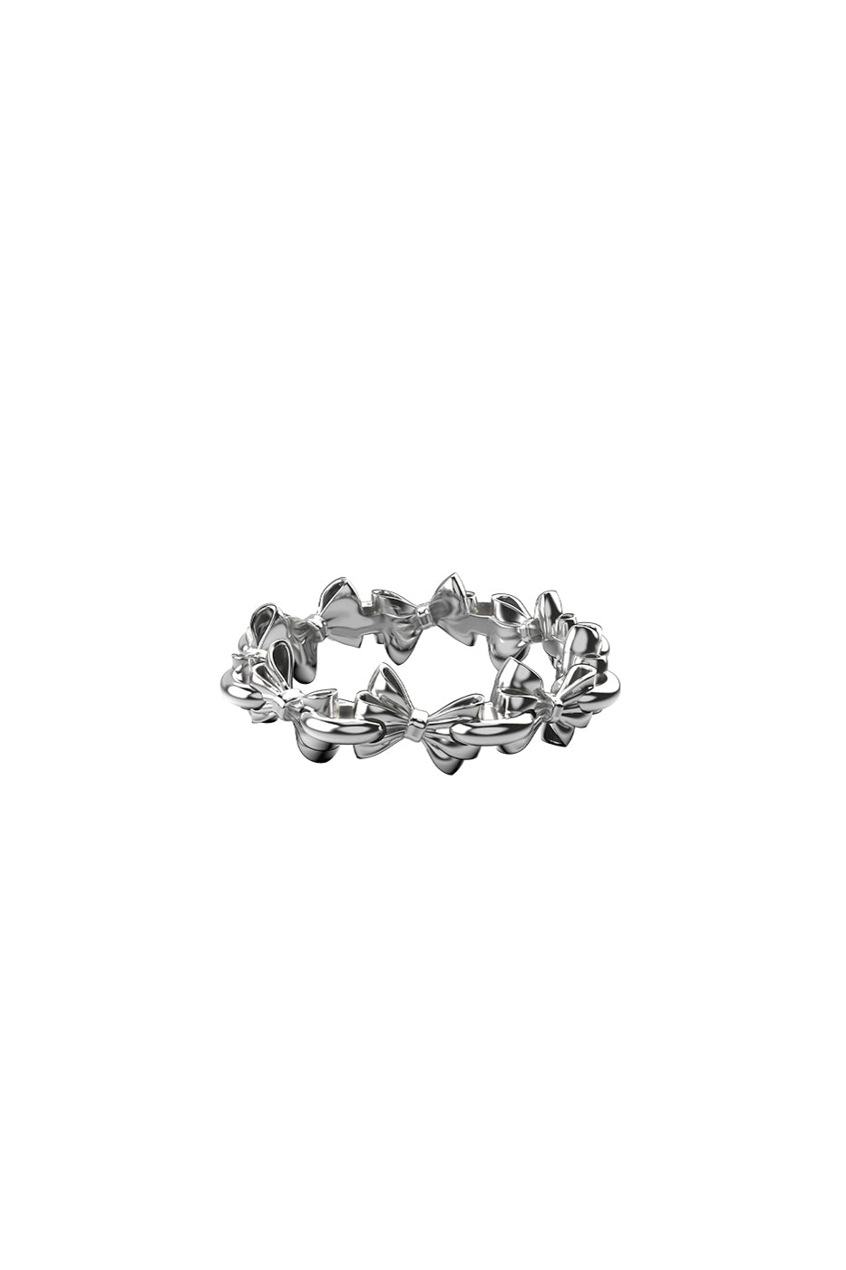 The Bow Infinity Ring in sterling silver forms a continuous loop of interlocked sculptural bows. Each bow is shaped in relief, joining to the next in an unbroken flow of form and sentiment. Refined in scale, the silhouette reads as feminine, structural, and infinitely wearable.